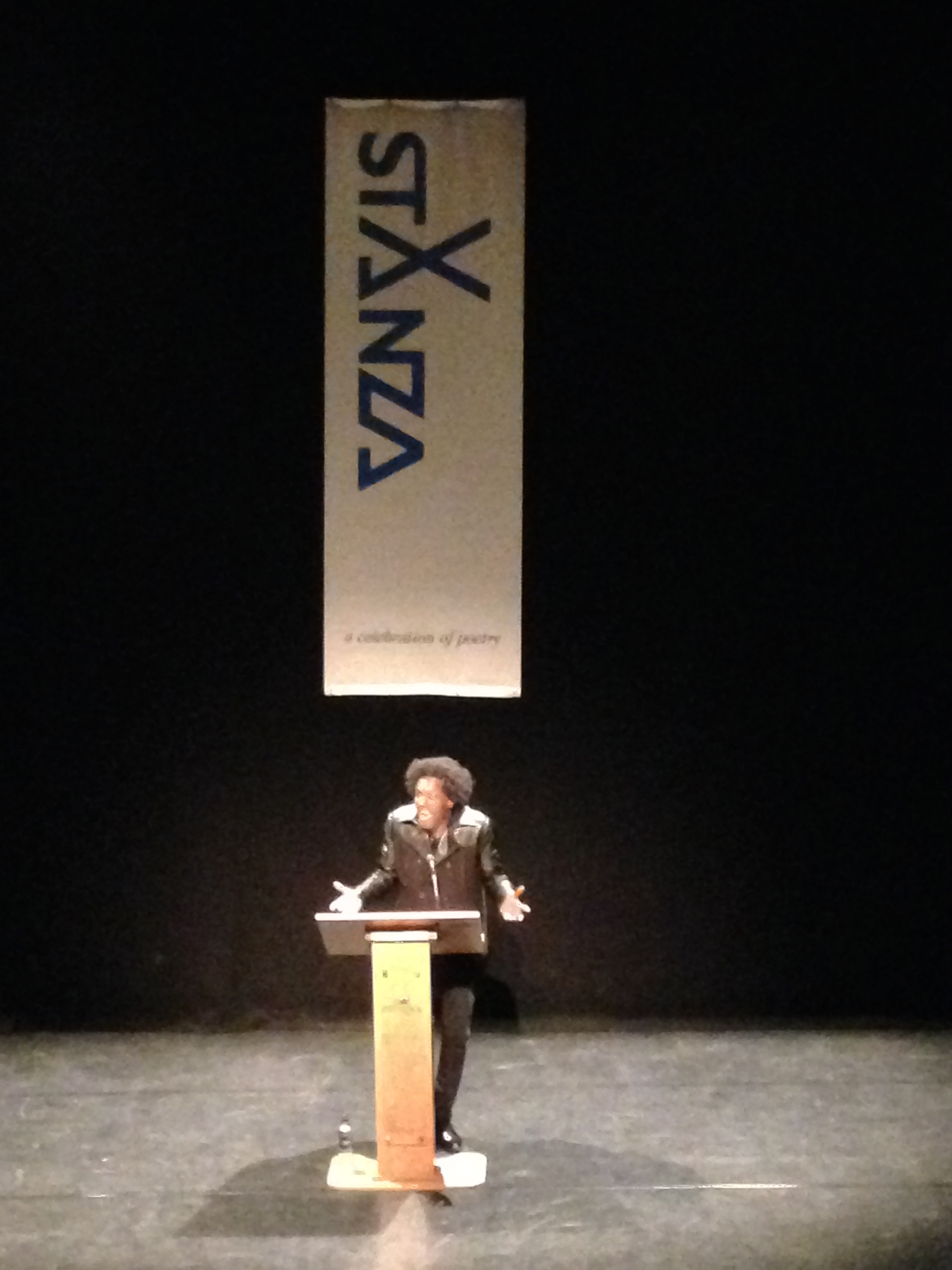 Since it’s the chief focus of my research, and since StAnza offered so much food for thought around it this year, I’d like to reflect a bit on the concept of performance in poetry here. Unfortunately this is prompted mainly by a rare negative occurrence at the festival, in which a heckler interrupted Lemn Sissay’s Centre Stage performance about 10 minutes in. Lemn had opened his set with a poem then engaged the audience in some banter, including a witty extended joke about the bureaucratic frustrations of finding funding for creative endeavours. The audience were right there with him (most of us, at least), laughing along. He then made a joke about not having performed a poem in perhaps five minutes, and at that point the heckler shouted something to the effect of “This is stand-up comedy; I paid for poetry.”