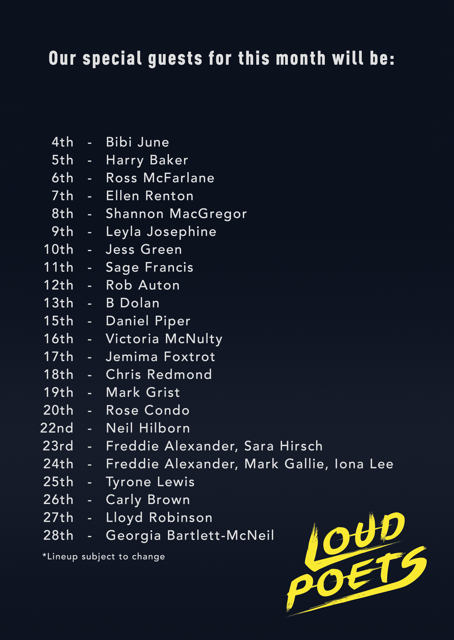 Our show this year also features a different guest poet every night. We’ve curated a spectacular lineup featuring the best of spoken word in the UK and beyond, with emergent local talent and seasoned veterans of the international scene. Check out our full guest lineup below: