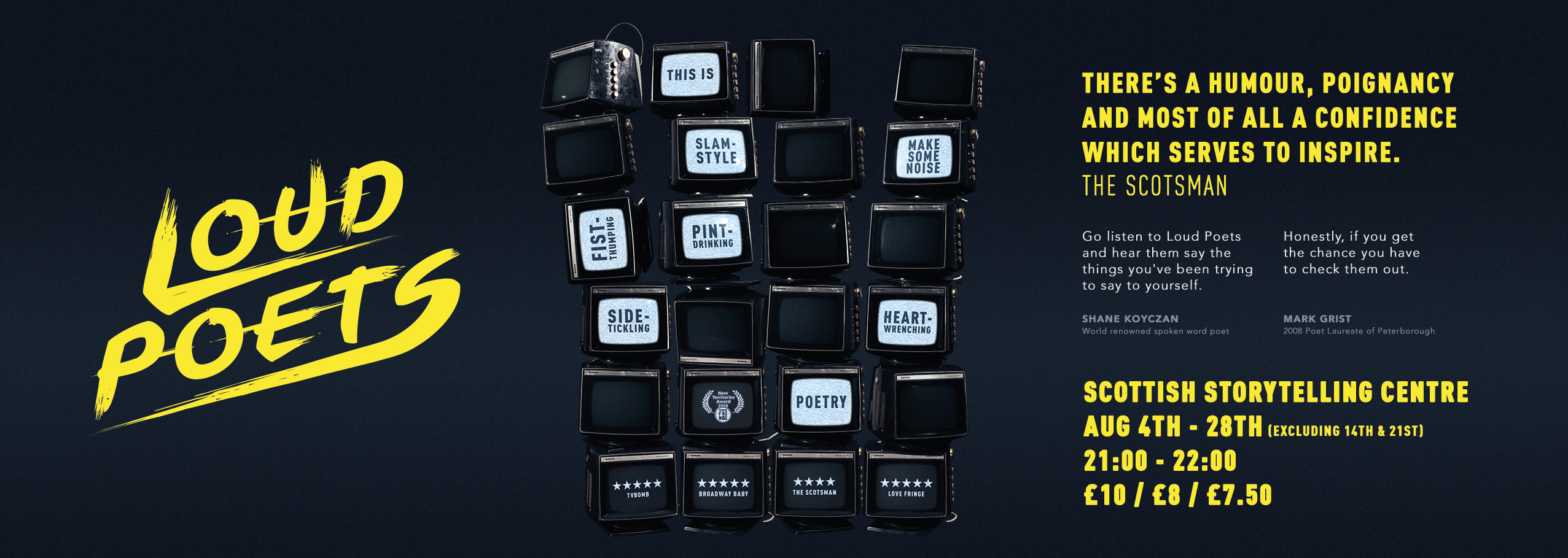 July is nearly through, which means it’s almost time for the Edinburgh Fringe! I’m delighted to be performing again this year as part of the core cast of Loud Poets. We’ve worked hard to craft a brand new show featuring spoken word poetry in a range of styles accompanied by live music from our band Ekobirds and stunning visuals created by our videographer Perry Jonsson. This year’s show takes our usual showcase format and adds a thematic twist… we’re very excited to share it with you. The show runs August 4-28 (not 14 or 21) at the Scottish Storytelling Centre. Tickets and more information can be found through this link.
