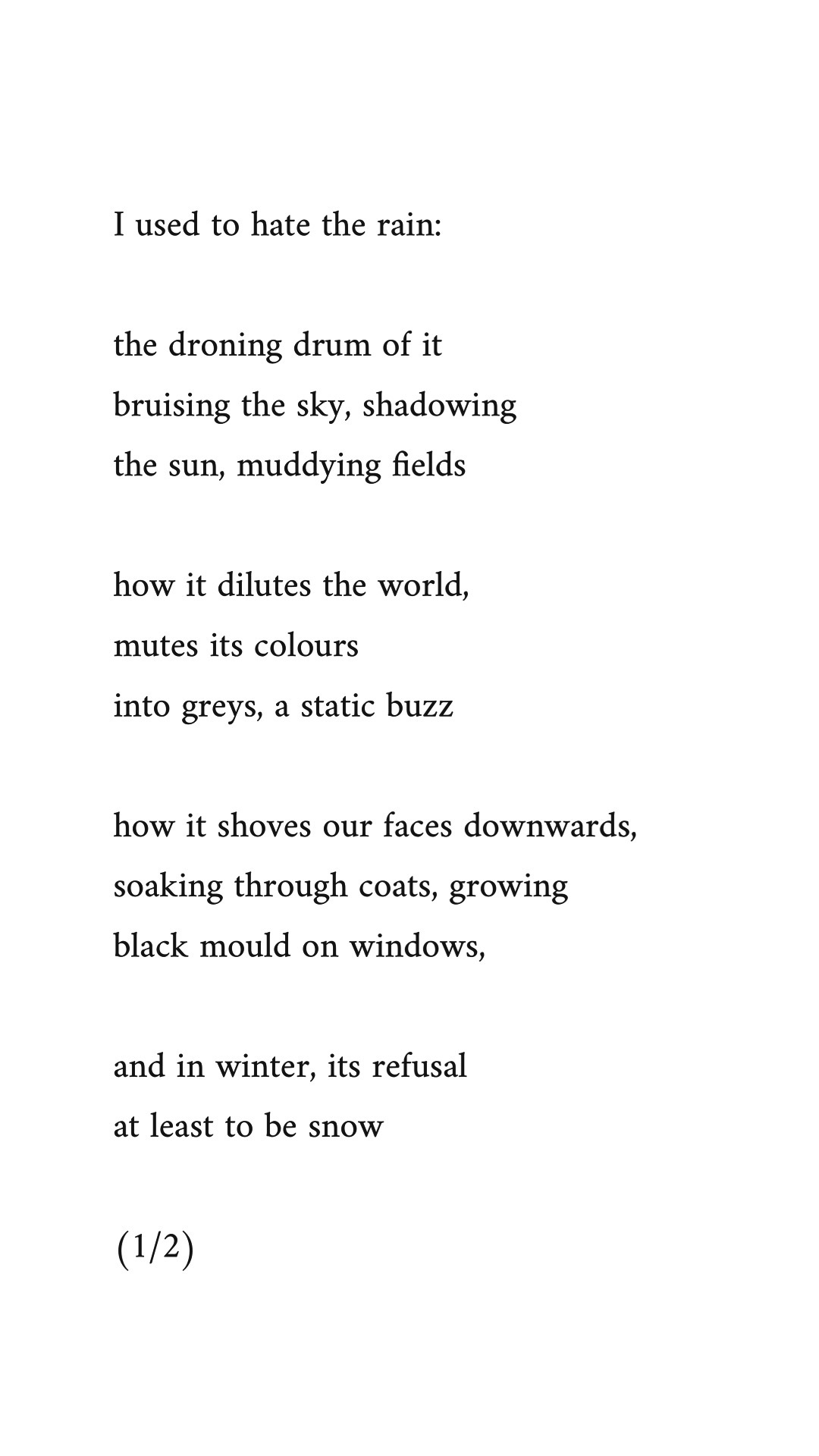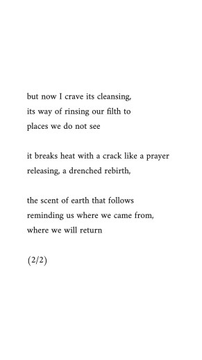 Day 2’s poem was inspired by a prompt posted by Apples & Snakes to start a poem with the line “My taste for rain has changed.” I began there, drafted the piece, then went back in and changed the first line.