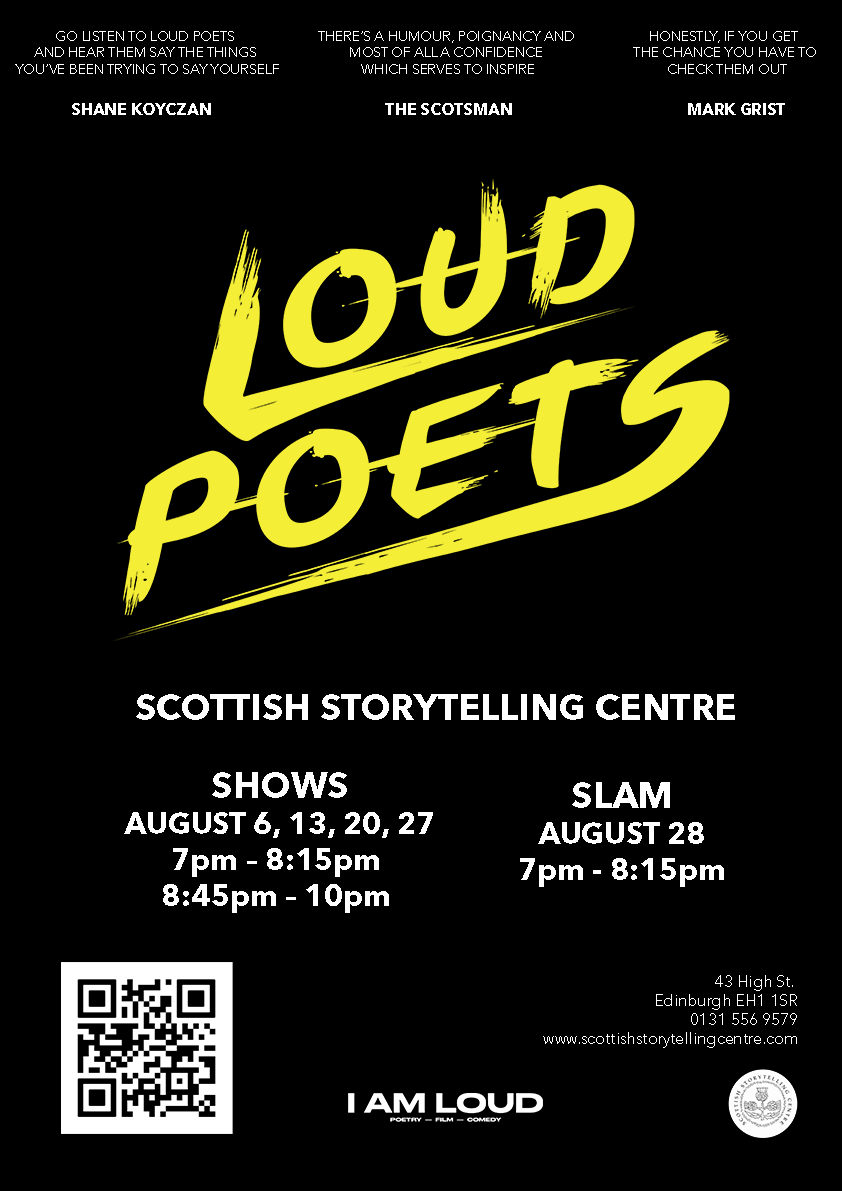 Loud Poets are returning to live events for the Edinburgh Festival Fringe in one week! This will be our seventh run at the Fringe and we couldn’t be more excited to return. Every Friday in August we’re performing two live shows (7:00-8:15pm & 8:45-10pm) at the Scottish Storytelling Centre, plus a slam on Sat. 28th. Tickets are now available through this link.